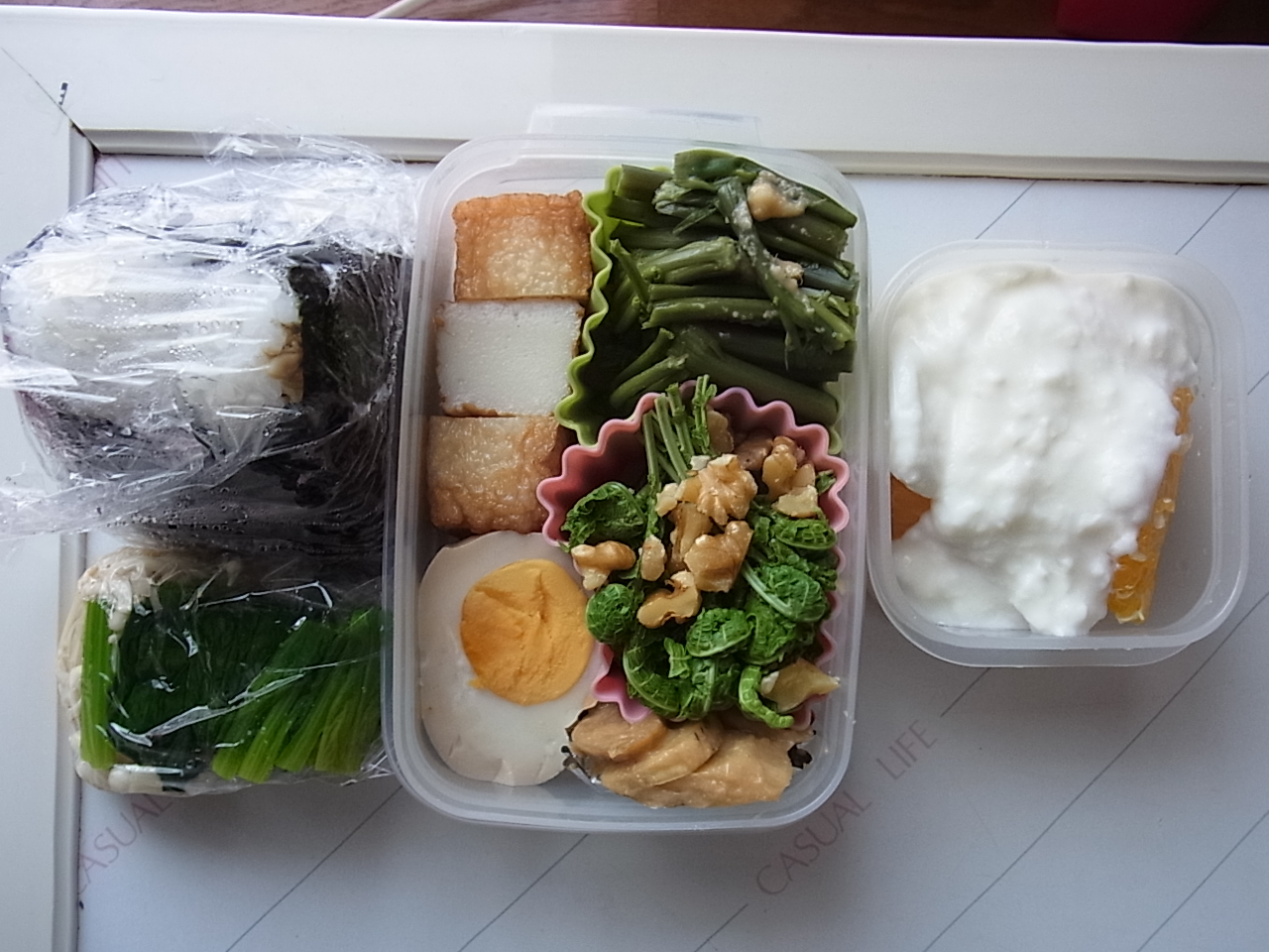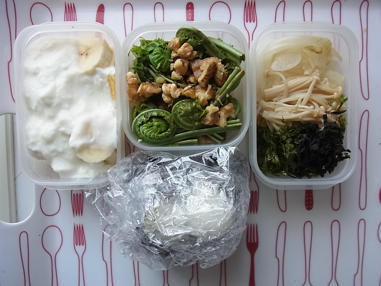 2013.05.15 おにぎりと山菜、煮卵、フルーツヨーグルト