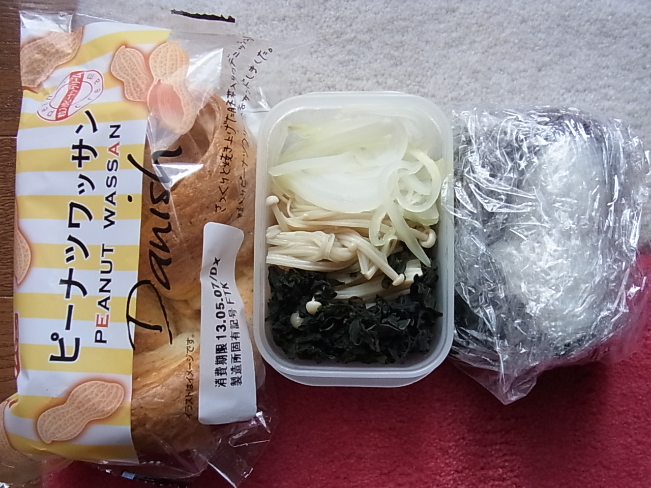 2013.05.07 シラスと小松菜の自家製ふりかけおにぎりと味噌汁、ピーナツクロワッサン