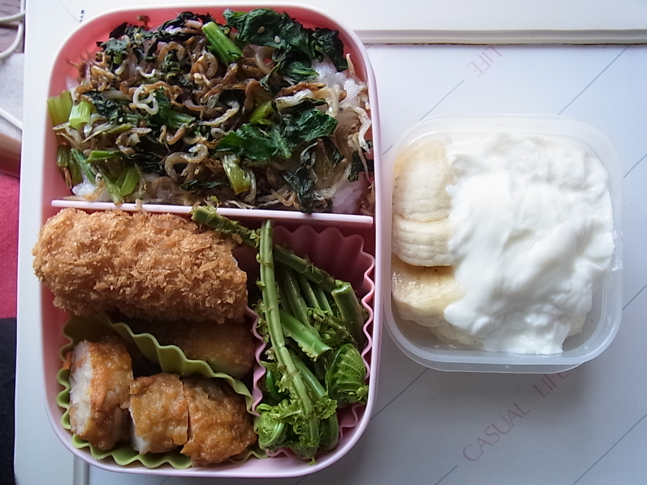 2013.05.10 シラスと小松菜のふりかけごはんとソーセージと鶉のフライ