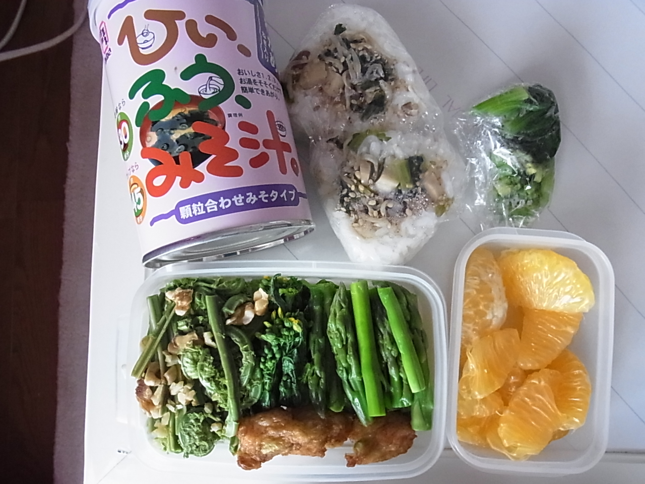 連休明けのお弁当は、おにぎりと具材たっぷり味噌汁からスタートです。