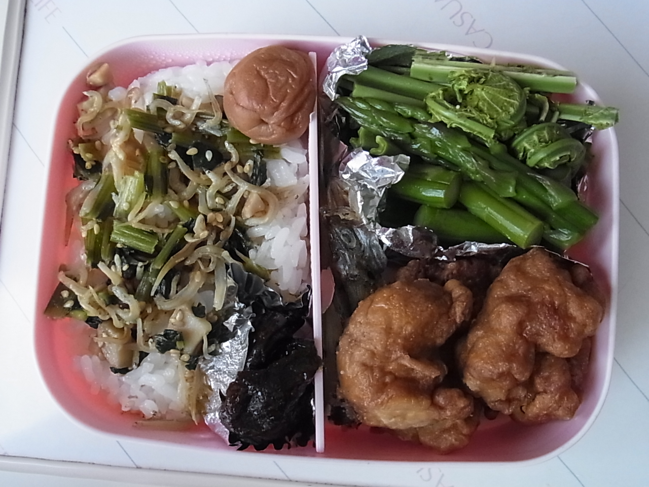 2013.05.25 から揚げ弁当 山菜、アスパラお浸しつき