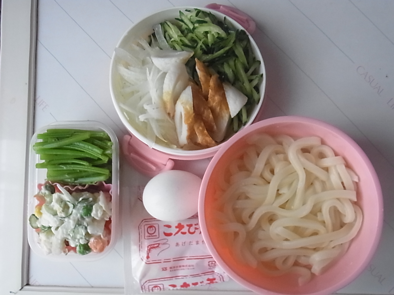 2013.06.12 サラダうどん弁当温玉添え ポテトサラダ、ミズのお浸し添え