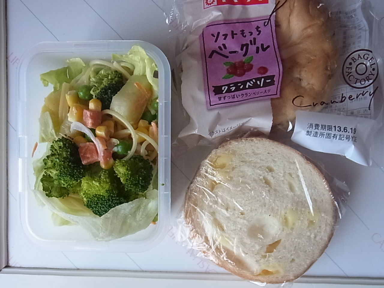 2013.06.20 ソフトもっちベーグルクランベリー、チーズパン、スパゲッティサラダ