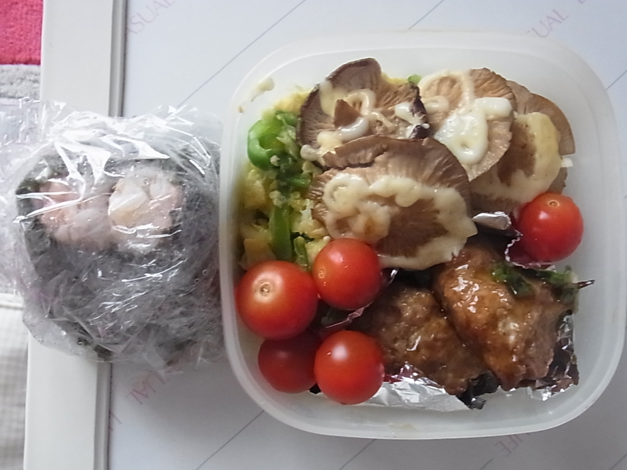 2013.06.26 シイタケマヨ焼き、千切キャベツの卵とじ、中華肉団子