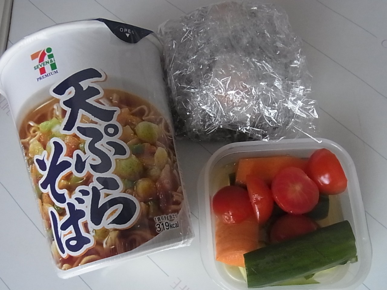 2013.06.25 カップそばとキュウリ、ニンジン、プチトマトのピクルス、おにぎり