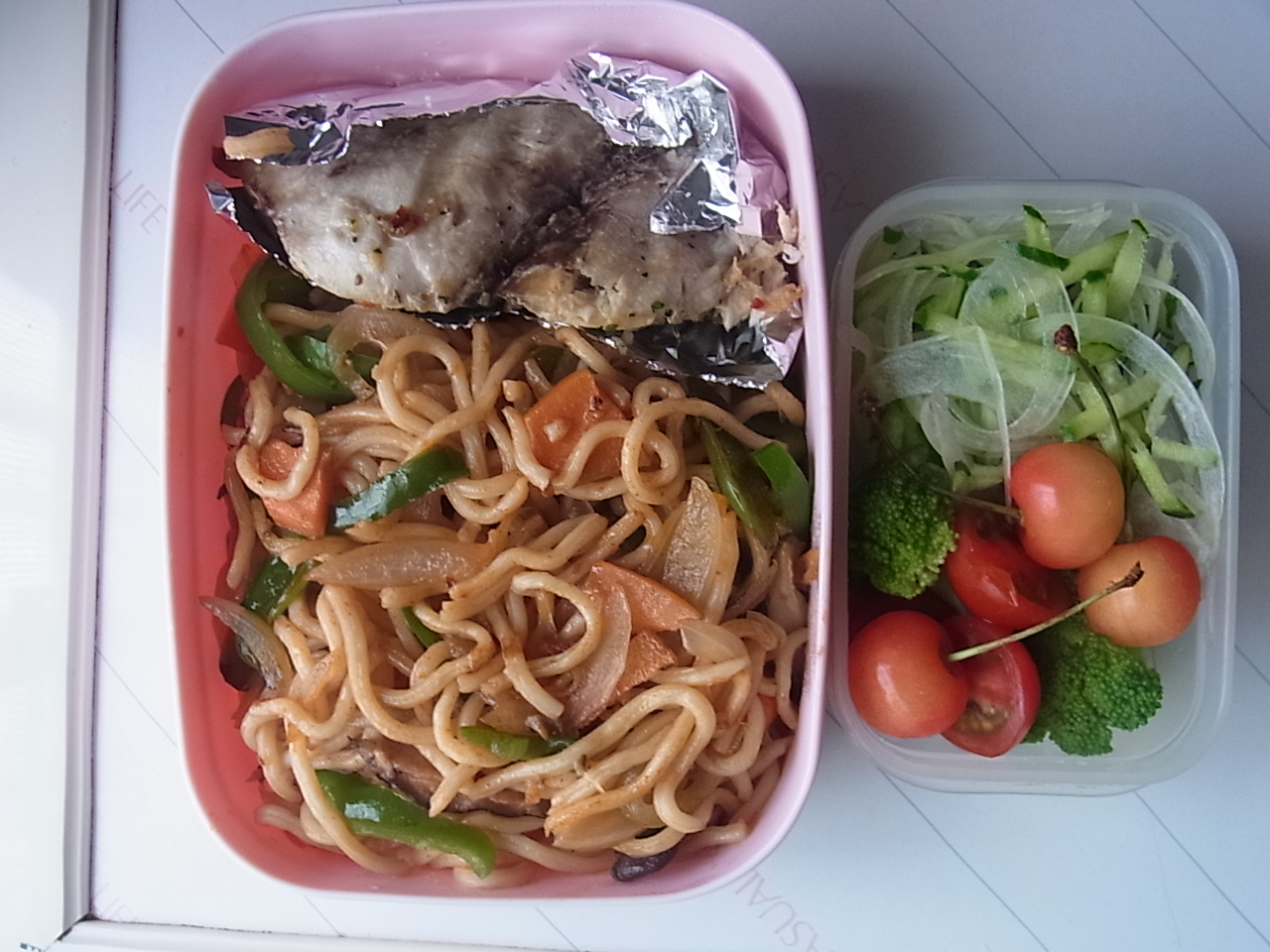 2013.07.04 ナポリタン弁当 ぶりのバジルオイル焼き、サラダ添え