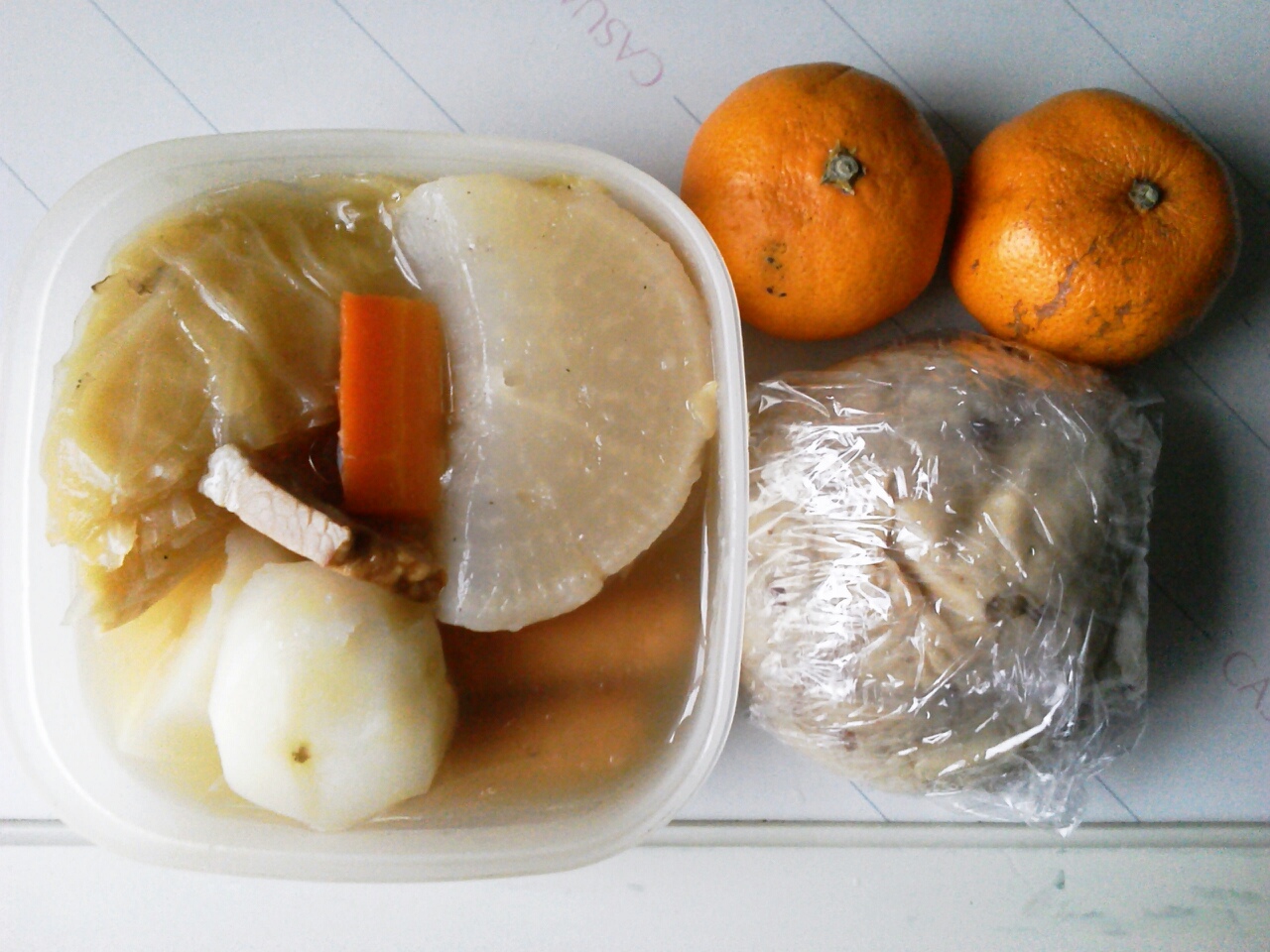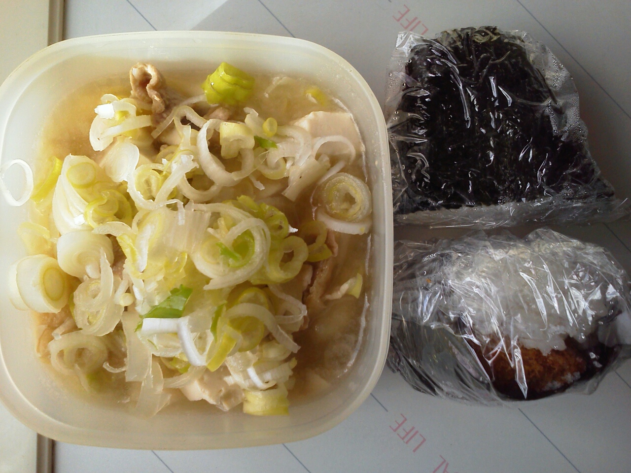 2014.01.15 豚汁と鮭と白身魚フライのおにぎり