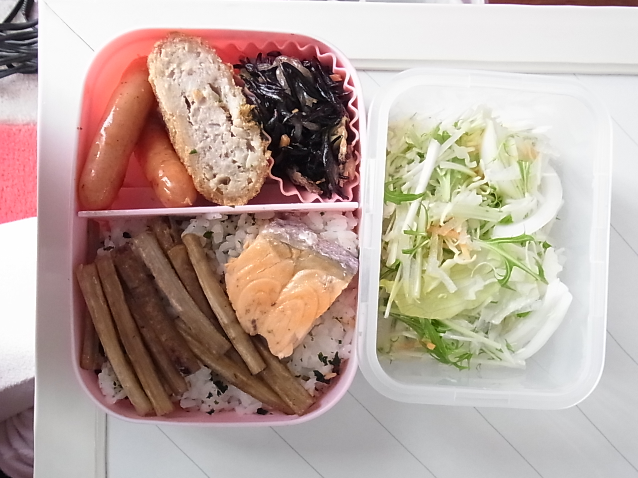 2013.02.18 メンチカツとひじき煮、わかめご飯弁当
