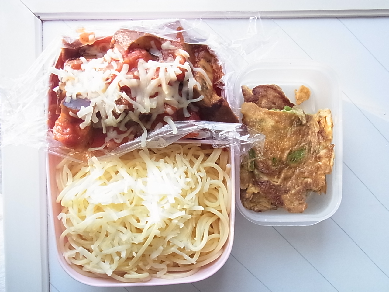 2013.02.28 ナスのトマトソーススパゲッティ、納豆オムレツ添え