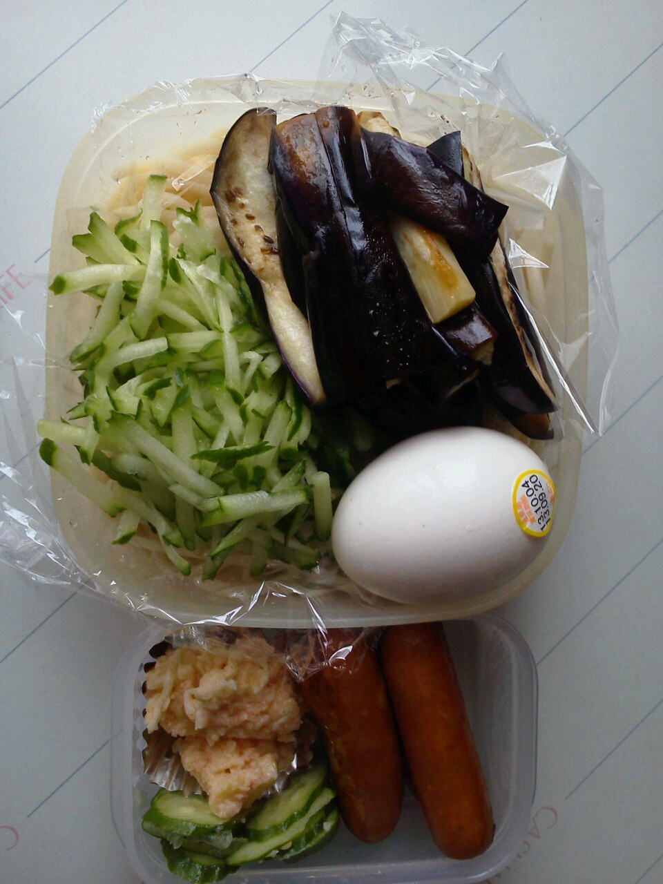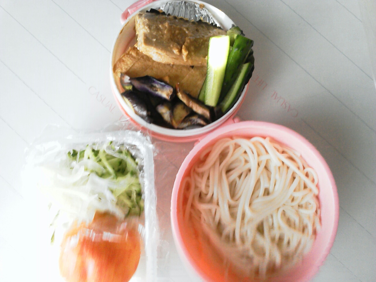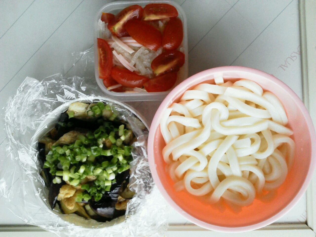 2013.09.24 ナスとキュウリ、温玉の冷たいうどん トマトサラダ