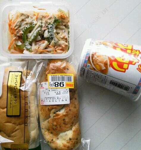 2013.09.07 白石パンコッベパンミルククリームとカップワンタン、サラダ