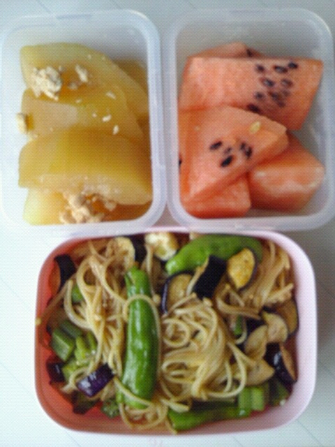 2013.08.22 夏野菜スパと冬瓜のそぼろ煮、スイカのデザート