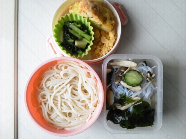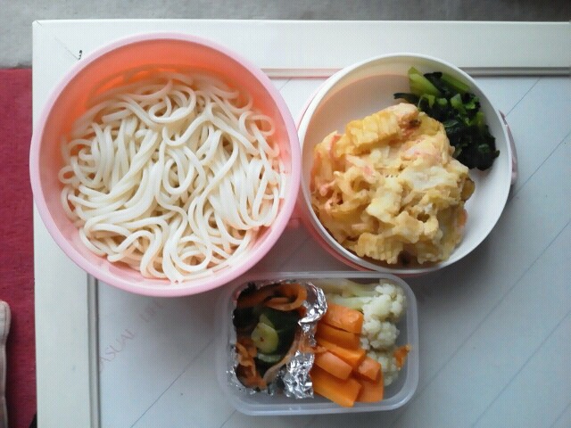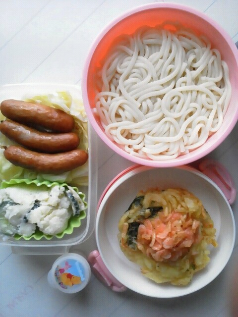 2014.06.14 冷やしかき揚げうどん ポテサラ、温キャベツソーセージのせ